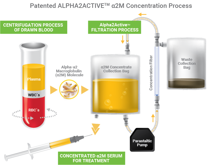 Unlike hemoconcentrators or generic protein concentrators, ALPHA2ACTIVE™ utilizes patented filtration technology to harness authentic Alpha-2-Macroglobulin (A2M) both precisely and effectively. A2M can be collected and concentrated through 3 simple steps that come in a convenient kit form for providers in the USA.
